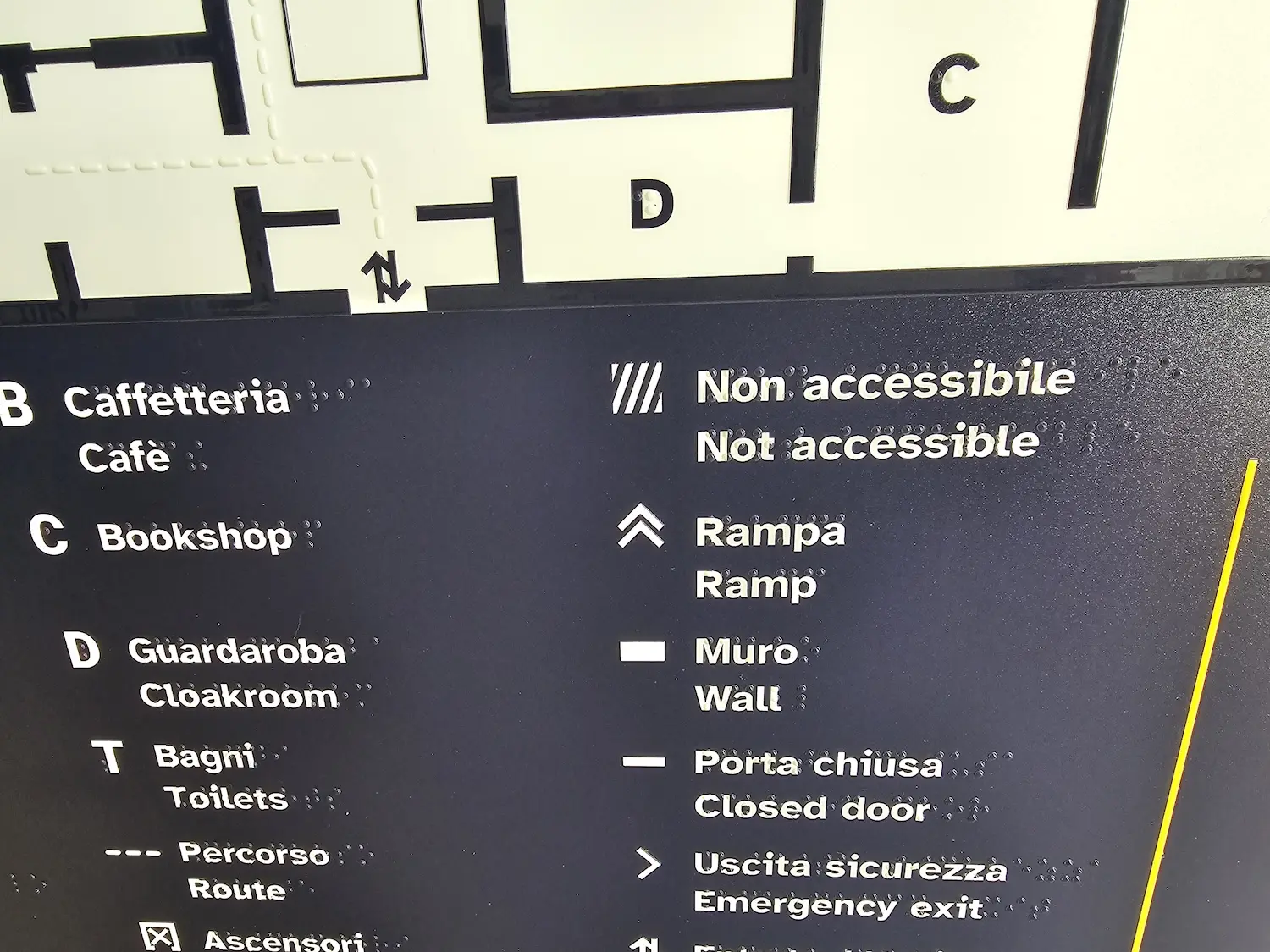 Le principali informazioni atte a garantire l’accessibilità in autonomia sono riportate su pannelli tattili e in braille. Tutti i dispositivi didattici, come pannelli e didascalie, sono stati realizzati per la massima inclusività: i contenuti descrittivi sono disponibili, tramite QRcode e dispositivi NFC, in audio/video in italiano, inglese, francese e Lis.